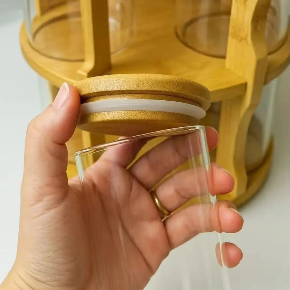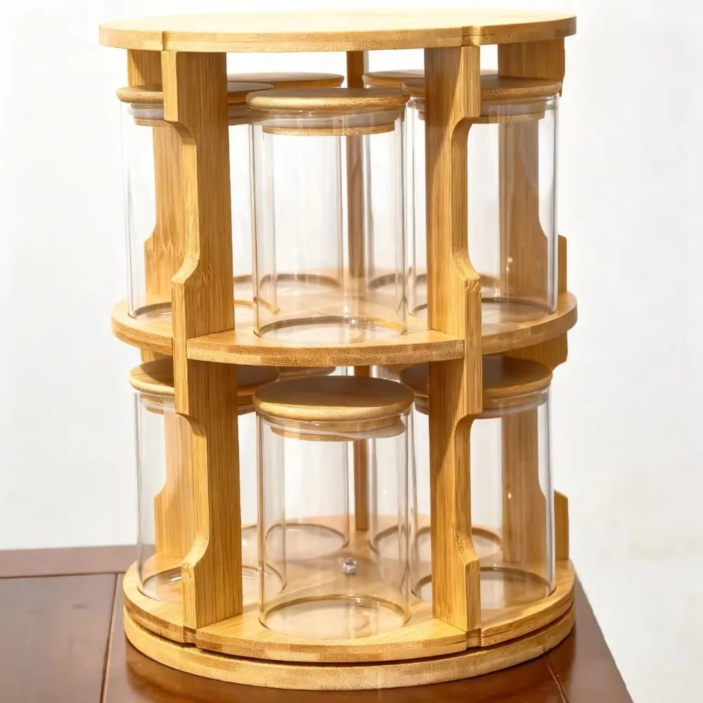 منظّم دوّار 360°، فيه قوارير زجاج مع غطا خشب بامبو طبيعي، عملي وأنيق للكوزينة الجزائرية.