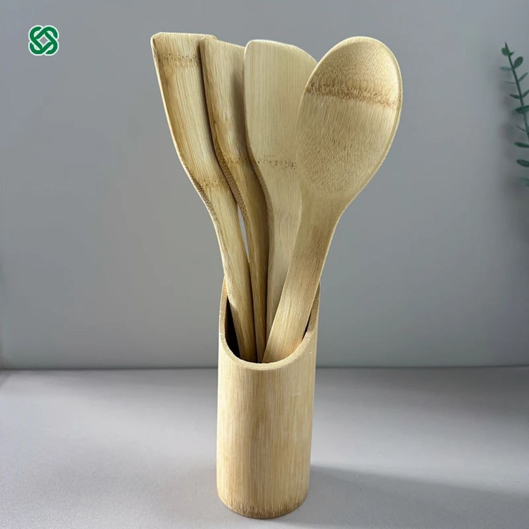 🍴 + 5 أدوات مطبخ بامبو حرفية مع حامل منحوت