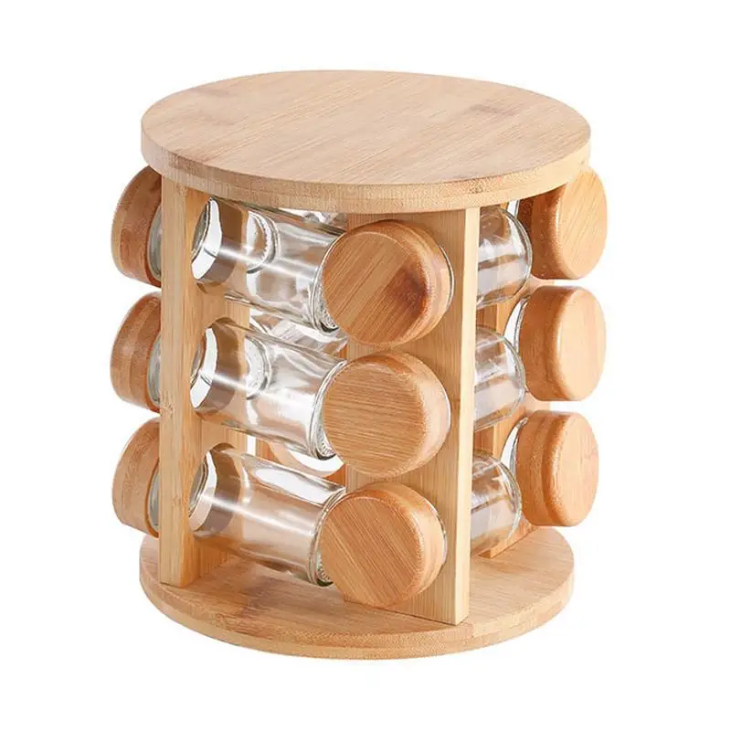 باك فاخر: رف توابل بامبو دوّار 12 قطعة + 5 أدوات بامبو حرفية